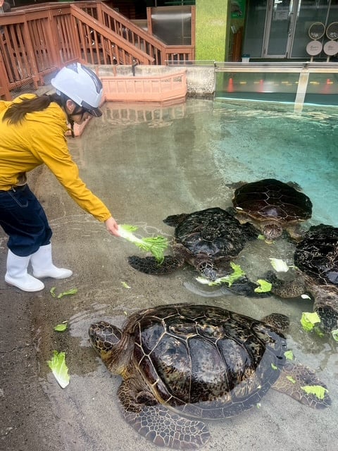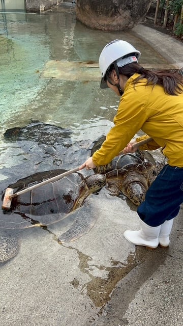 今回あんにゅさんは、えのすいの「ウミガメの浜辺」でウミガメの甲羅のお掃除とえさやりを体験させていただきました!