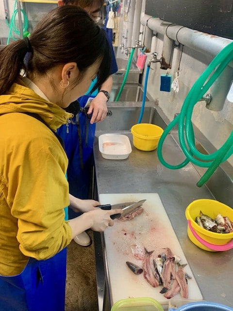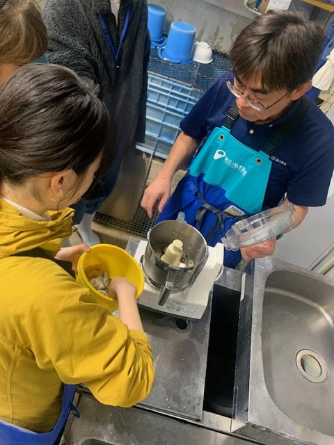 鯖の頭や内臓をカットしてぶつ切りにしたり、生あさり、あみ、イワシを2本の包丁使って軽快にトントントン♬とミンチを作ったり、そのほか、クラゲ用の牡蠣も使って調理!