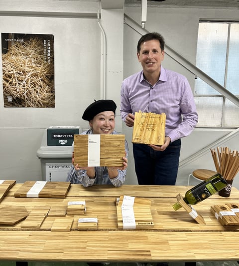 「ChopValue」の創業は、2016年、カナダのバンクーバー。2024年に、世界9カ国目となる日本についに上陸!今年2025年4月には、川崎市中原区に日本第一号となる小規模工場 マイクロファクトリーを稼働させました。使用済み割り箸を資源として近隣から回収し、マイクロファクトリーで加工して、テーブルの天板や家具・室内の壁用ボードなどに加工する新しい循環型の経済を実践されています。