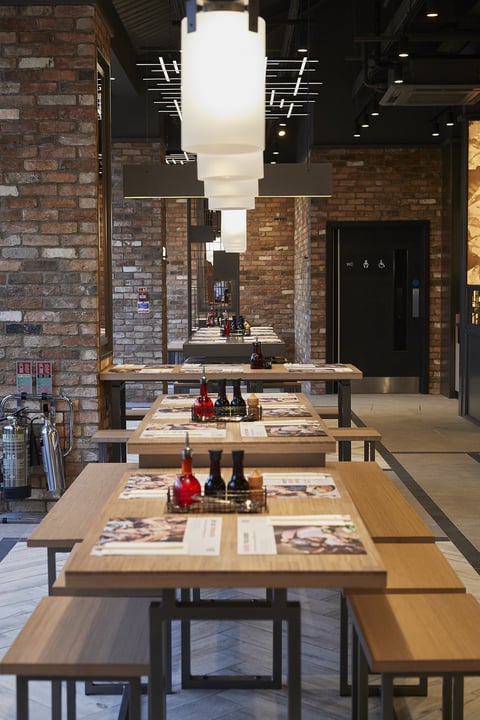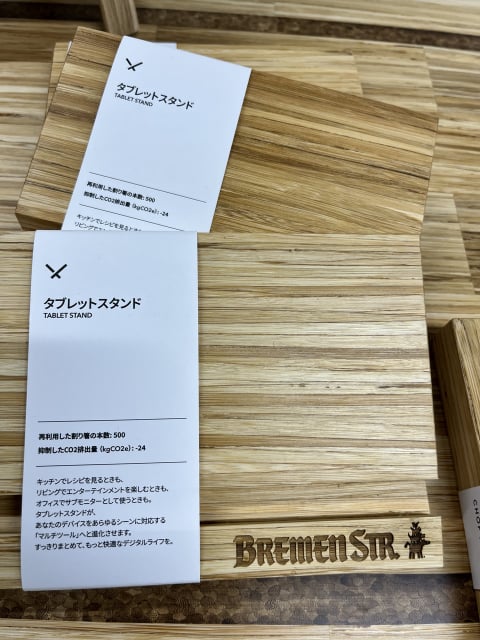 私たちがインタビューで座っていたテーブルとベンチ。とても大きく、6人の大人がゆったりと利用できるもの。テーブルに使われているリサイクルされた割りばしの数はなんと3万6000本!抑制したCO2は、-1711kgCO2!数十分で捨てられてしまう使い捨ての割りばしが、こんなにも美しいテーブルになっているのはとてもうれしくなりました。