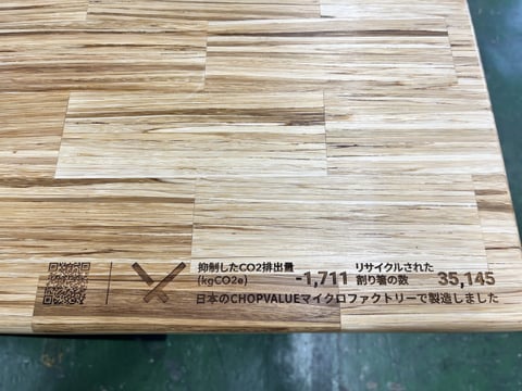 ChopValueがつくるテーブル、ベンチには、どちらにも、この板を作るのにリサイクルされた割りばしの本数、抑制したCO2排出量、そして、どこで作られたのかが焼き印で刻まれています。