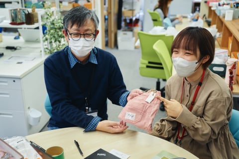 NFCチップは、ただ服に貼り付けられるわけではありません。カーテンの端切れなどを再利用して作られた、手作りのお守りのような小さな袋に入れられ、一つひとつ丁寧に取り付けられています。そして、この素敵なお守り袋を作っているのが、就労継続支援B型事業所の利用者の方々。服を循環させるだけでなく、社会の様々な人たちが関わる機会を生み出している点も、このプロジェクトの大きな魅力です。
