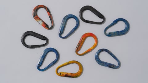 ビーチクリーンでも目立つ「釣り糸」をPOPUPイベントなどで回収。釣り人たちは、狙う魚や道具によって釣り糸の素材にこだわりがあるため、素材(ナイロン、PE、ポリエステル、フロロカーボン)の特性を理解して、釣り糸を選んでいる点に着目し、イベント会場では素材ごとに分別回収! 回収した釣り糸は、「カラビナ」や、釣りをする時に便利な「トラッシュポーチ」などになり、コラボ商品としても展開し、釣りを楽しみながら環境を守る循環を生んでいます。