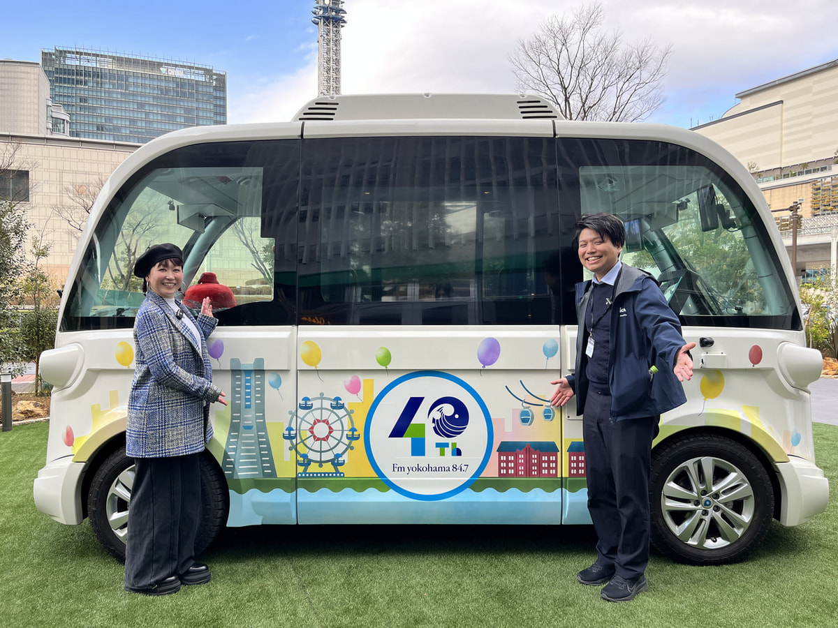 マクニカの自動運転EBバスは、単なる移動手段に留まりません。車体のラッピングデザインは、ご当地キャラや地元の学生デザイナーとのコラボが可能。今回はFMヨコハマ40周年記念として、FMヨコハマのロゴはもちろん、横浜の街並みや海・緑をイメージした特別仕様になっています。主役はあくまで地域の人々であり、テクノロジーを通じて街を活性化させる可能性を秘めています。