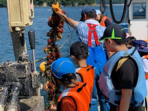 森に入ると増えすぎた鹿の痕跡を目の当たりにし、漁師の方と海に出れば温暖化の影響で生業とされているる養殖の難しさや魚の種類が変わってきたことを知ります。