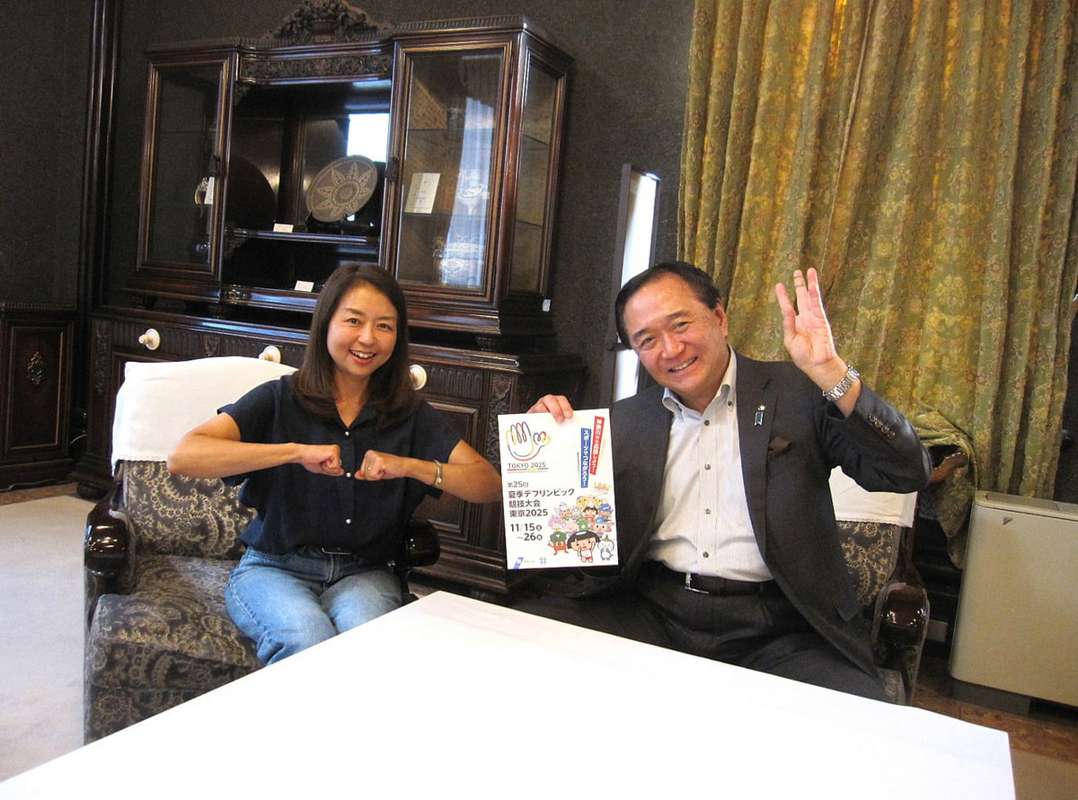 二人の写真のポーズは、柳井さんが「がんばれ!」、知事が拍手を手話であわらしています。