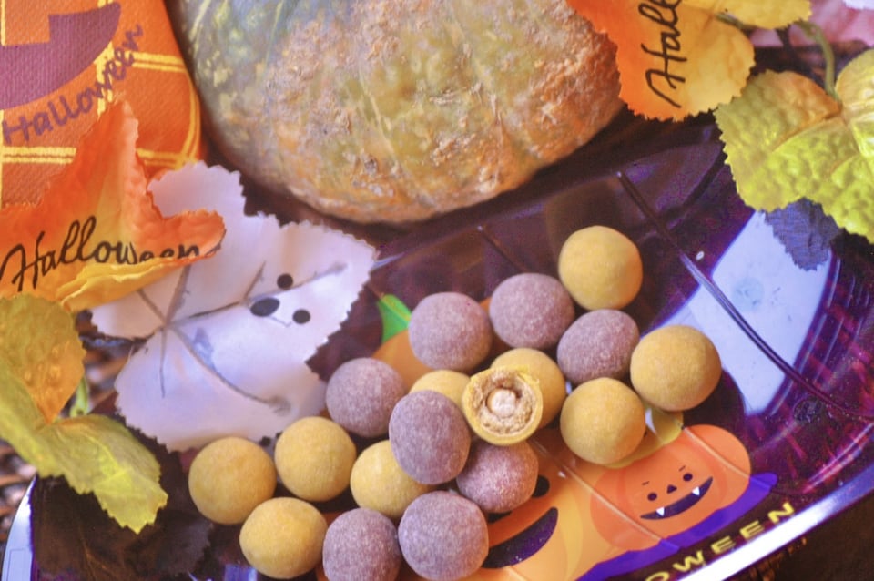 中身はハロウィンチョコ(きなこ麦チョコ)×2ヶ、紅白レーズン×2ヶ、りんご豆×2ヶ、大豆チョコレート×2ヶ、湘南ゴールドピー×2ヶの合計10個入り。