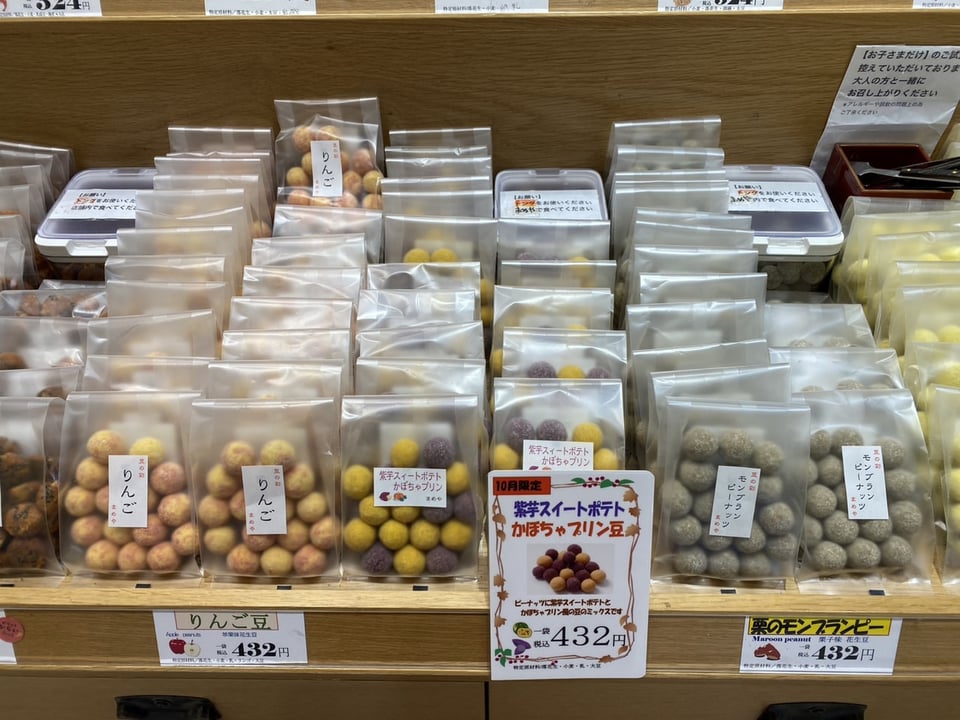 まず、月替わりの限定豆菓子である10月のお豆さんは「紫芋&かぼちゃプリン豆」(税込432円)。