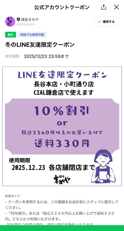 只今、鎌倉まめや公式LINEアカウントでは冬のLINE友達限定クーポンを配信中です!