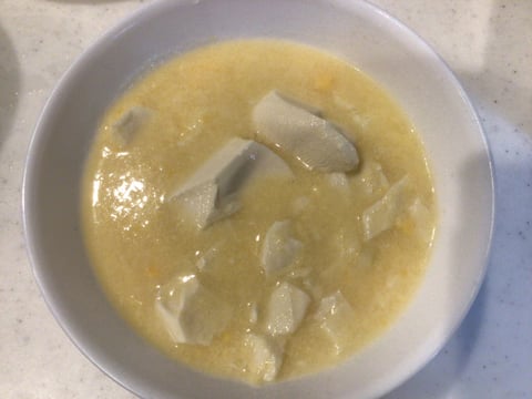 2)マグカップかスープ用の器に卵と水、中華だし、片栗粉を入れてよく混ぜる。お豆腐を入れてスプーンで崩す。![]()