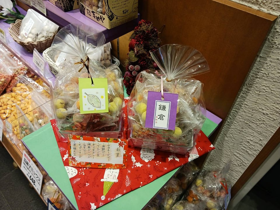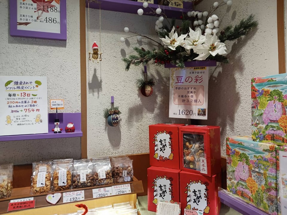 クリスマスプレゼントに添えるお菓子や季節のご挨拶に贈るギフト等、美味しい豆菓子をお求めの際には、鎌倉まめや長谷本店、小町通り店、シァル鎌倉店、そごう横浜店、ルミネ大船店や鎌倉まめやオンラインショップ (mame-mame.com)をご利用くださいませ。