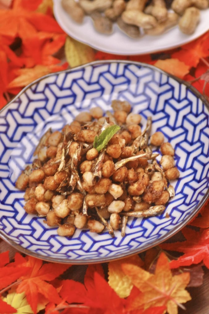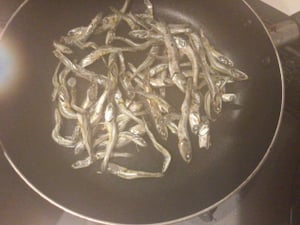 2)1を油でカリッと揚げ、煮干しも素揚げする。![]()