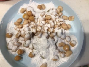 1)大豆の水煮を水切りし、片栗粉をまぶす。