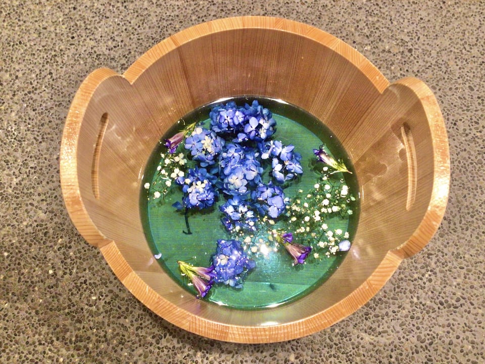 職人さんが一つひとつ手作りした木の桶には、そのお湯とお花とで鎌倉を象徴する海や空、紫陽花が表現されていて、何とも風雅です。