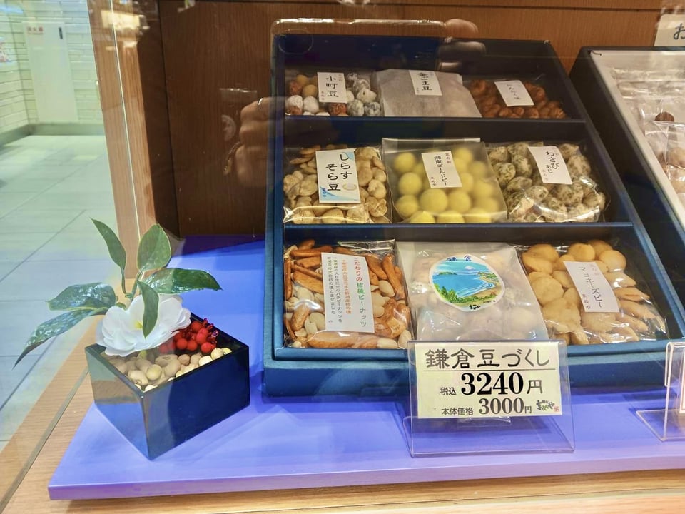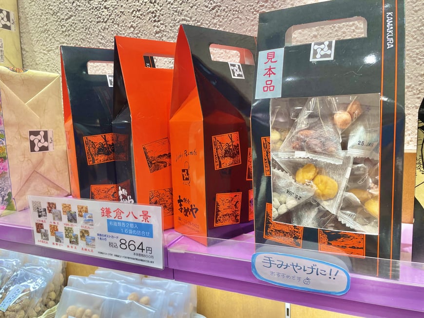 中身はその八景をイメージしたかのような鎌倉まめやの定番商品が入っていて、みそ落花生、マヨネーズピー、小梅豆、そら豆カレー、黒糖大豆、海鮮ピー、抹茶豆、ソフト塩豆のミニパックが各2袋、合計16個入りです。![]()