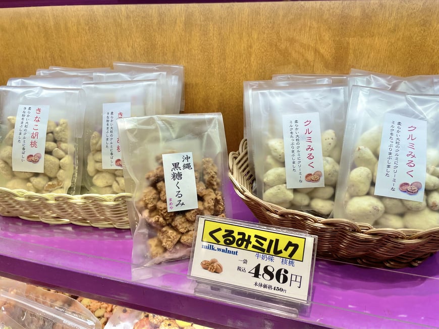 「きなこくるみ」(税込486円)と「沖縄黒糖くるみ」(税込378円)、「くるみミルク」(税込486円)の3種が揃っています。![]()
