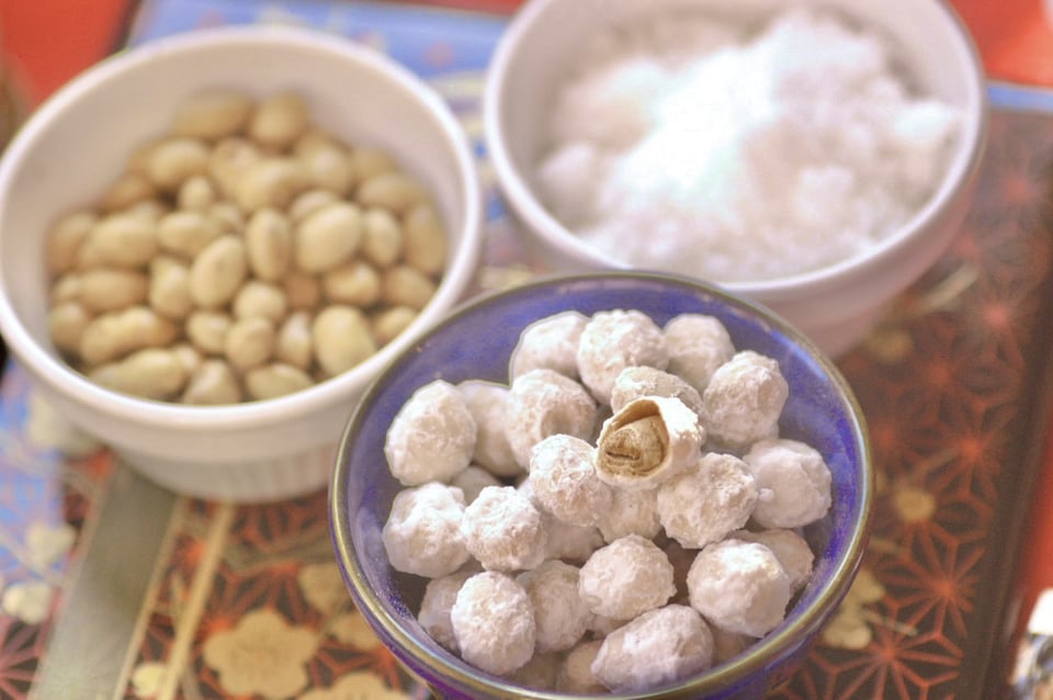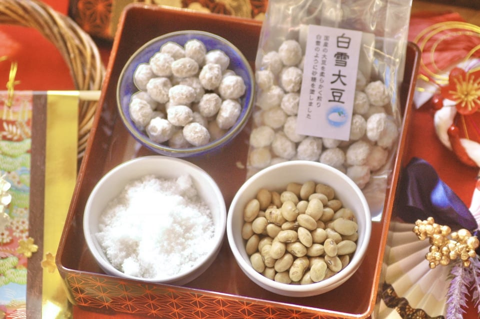 大豆にカリカリの衣をまとわせ白雪のように真っ白な砂糖をまぶしています。