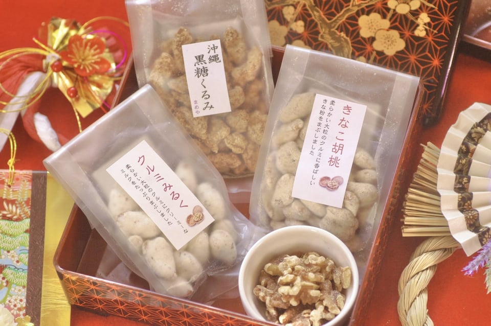 クルミを香ばしく焙煎して、その上にそれぞれ沖縄産の黒糖やきなこ、フレッシュなミルクをたっぷりまぶしています。