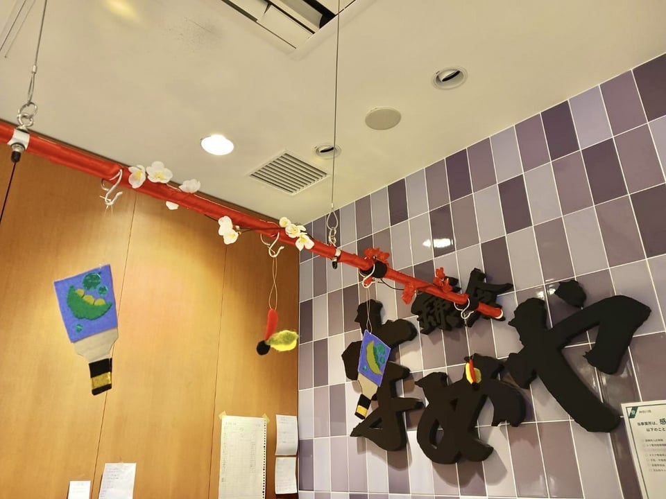 壁面には鏡餅型のニット帽を被った落花生のマスコットさんがブランコに乗っています。