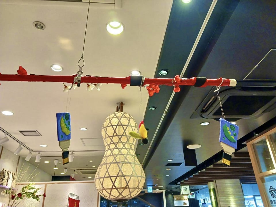 レジ上には豆柄の羽子板と羽根が空調に揺れています。