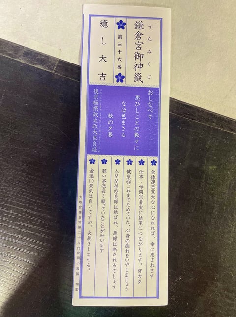 鎌倉の二階堂にある明治2年(1869年)に建立された格式が高い神社・鎌倉宮には「和歌(うた)みくじ」という特色あるおみくじがあり、人気を集めています。![]()