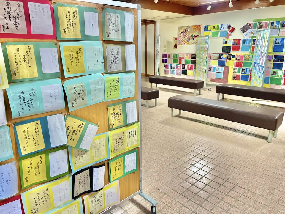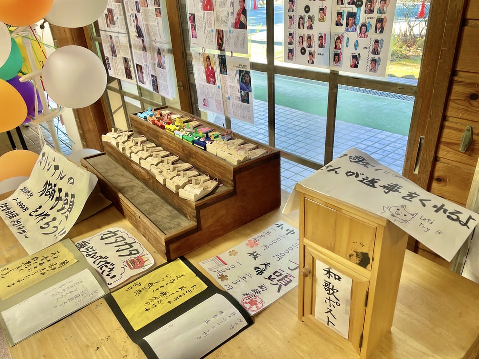 宮司の趣味である和歌の「歌合(うたあわせ)コーナー」もあり、参拝の方々が詠まれた和歌に宮司が和歌で返事をしたものを展示しており、老若男女さまざまな方々から送られた和歌と宮司の返した和歌は、展示さているものだけですでに1,000以上となっています。![]()