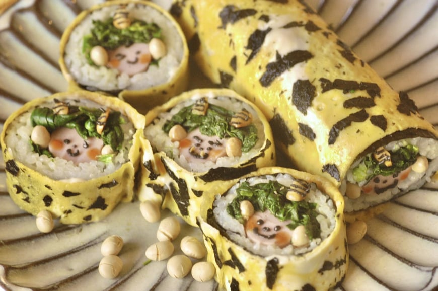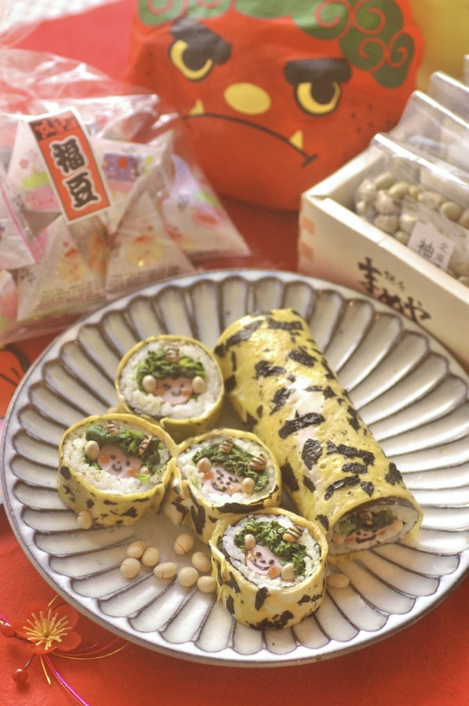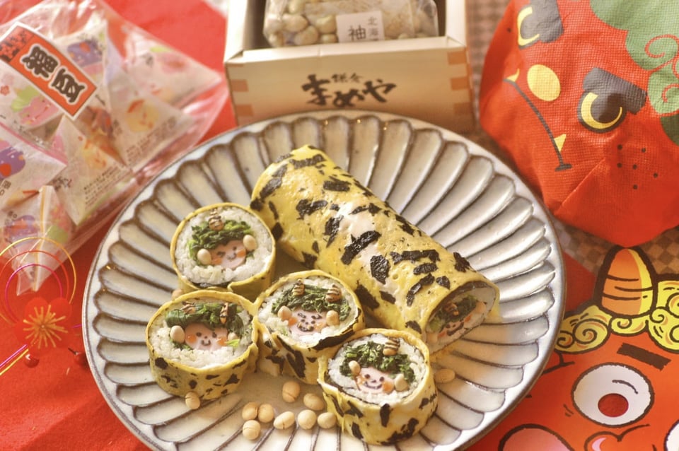 節分に大活躍の煎り豆を使い、今年は鬼のパンツ柄の玉子焼きを巻いた恵方巻を作ってみました。