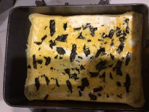 1)【玉子焼き】卵と豆乳、砂糖を混ぜて玉子焼き器等で薄く片面を焼く。上面が乾く少し間に海苔を切ってのせて虎柄(鬼のパンツ柄)にする。![]()