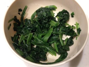 2)【ホウレン草ナムル】茹でホウレン草に胡麻油とお醤油を加えて混ぜる。