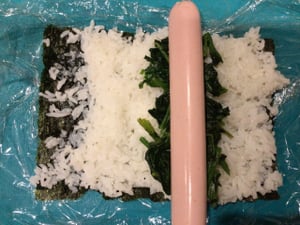 3)ご飯に酢を混ぜて酢飯にする。ラップの上に海苔、酢飯、ホウレン草のナムル、魚肉ソーセージを乗せて巻く。