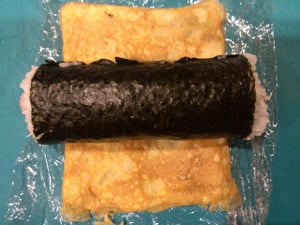 4)鬼のパンツ柄を下側にして、マヨネーズを薄く塗ってのり代わりにしてから3を巻く。![]()