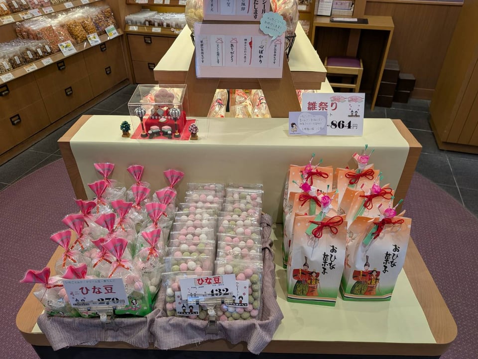 「ひな豆」(税込み432円)等、ひな祭り向け商品も各種取り揃えています。![]()