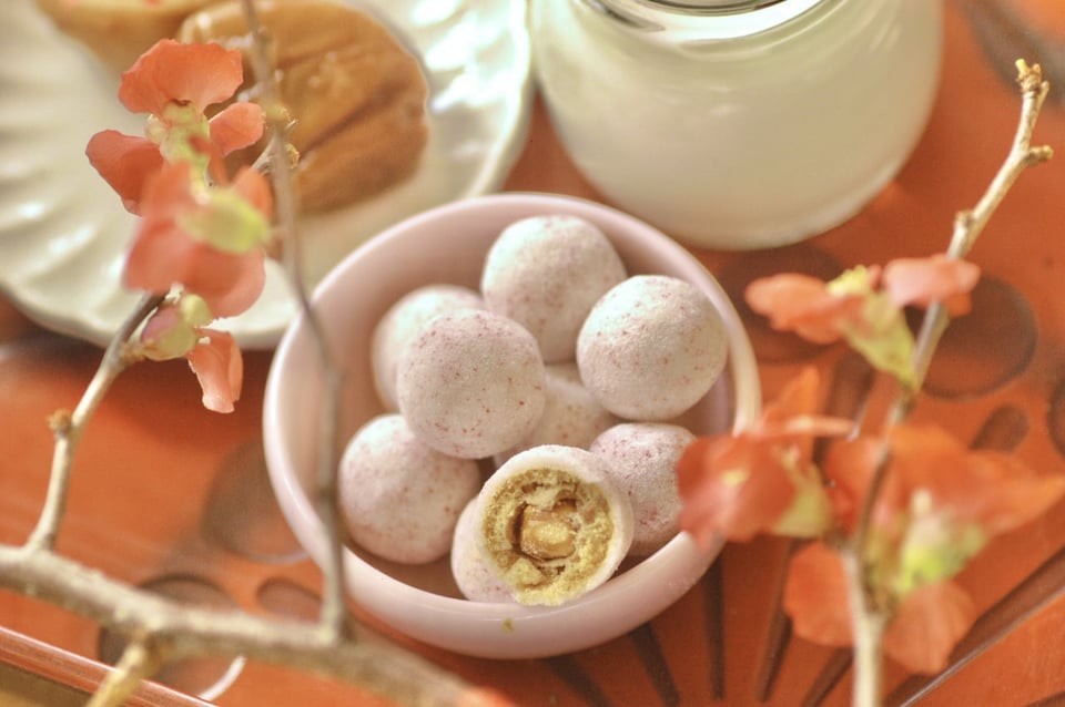 ピーナッツを包んだ衣にはミルクベースに梅酢の酸味を効かせ、クラッシュした梅をトッピングしています。