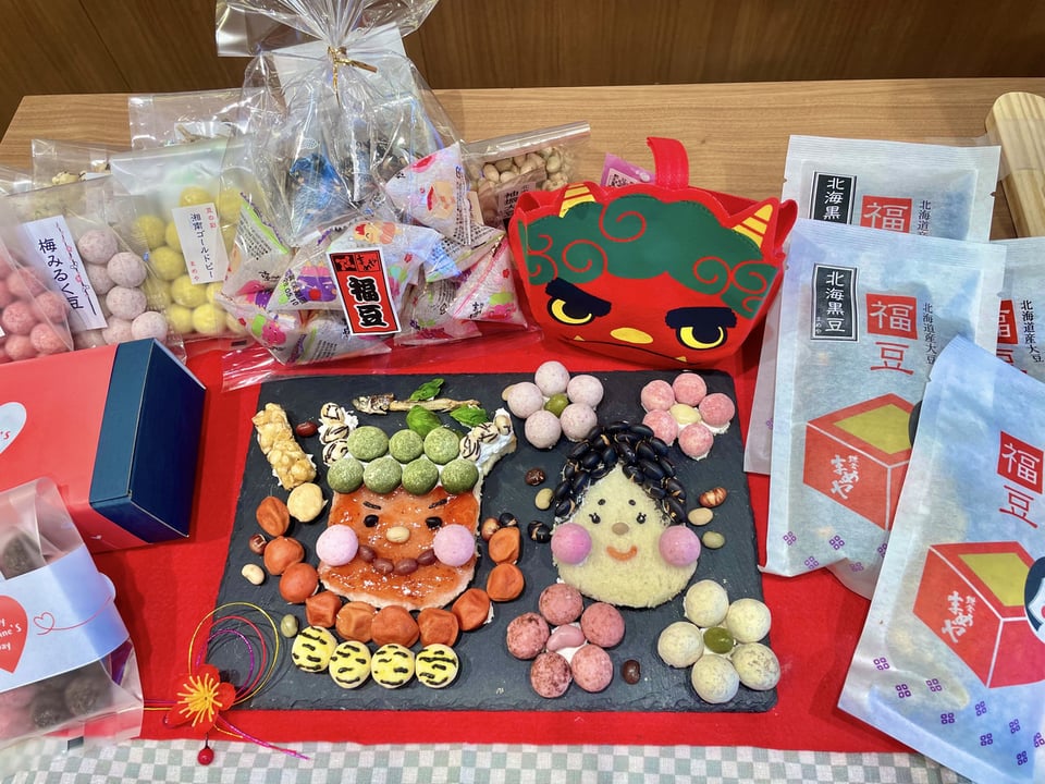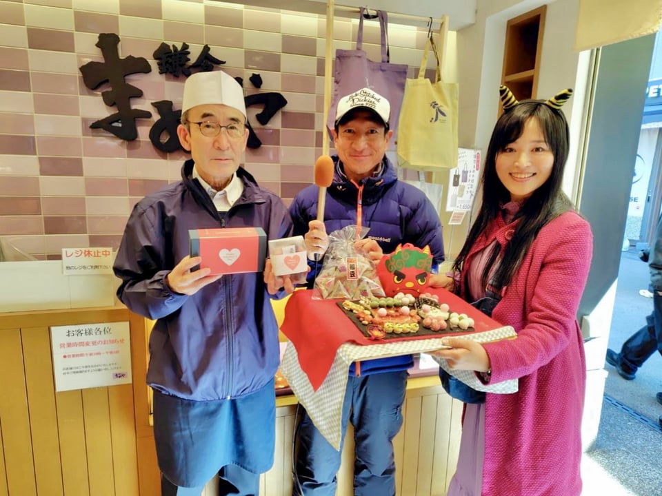 私からはこの番組「鎌倉まめヴィアージュ」と外で開催される「豆まき」のお話し、そして、毎年恒例、鎌倉まめやの豆菓子等を使った節分デコレーションを紹介させていただきました。