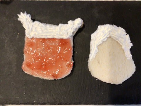 2)鬼さんの顔には苺ジャム、髪と角にはホイップクリーム、福の神の紙にはホイップクリーム(黒練り胡麻を混ぜても)を塗る。![]()