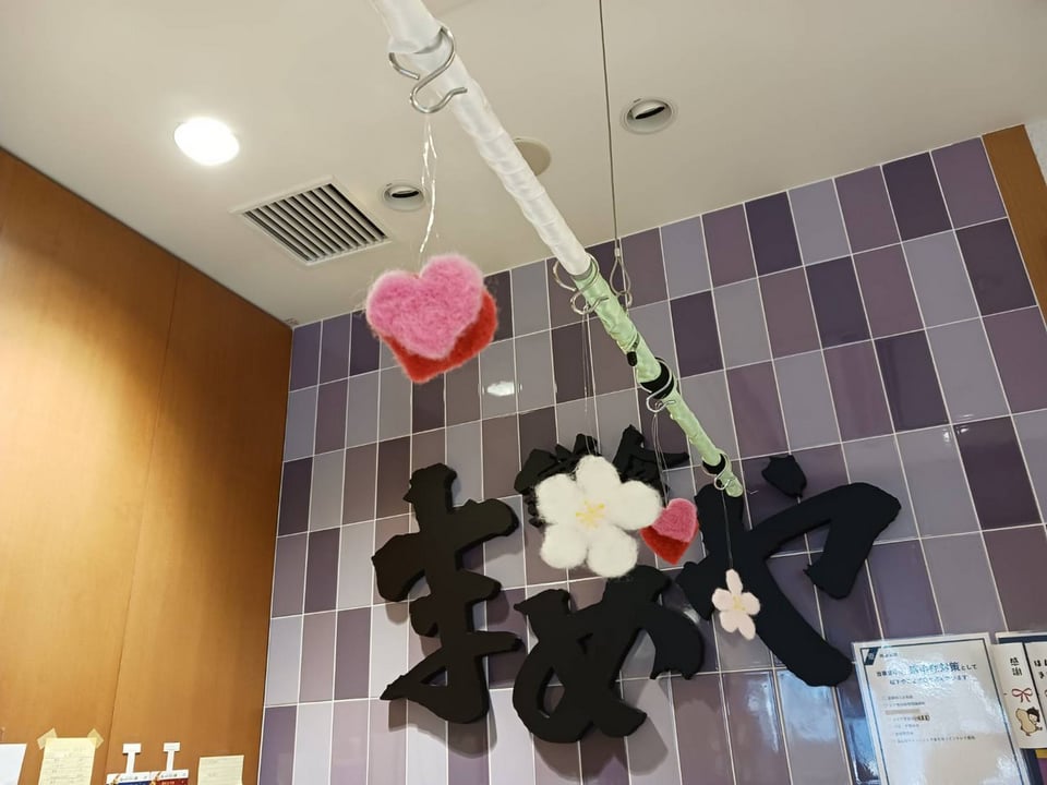 桃の花や菜の花、お雛様がしつらわれた壁面には可愛らしい色合いのニット帽&マフラー姿の落花生のマスコットさんがブランコに乗っています。