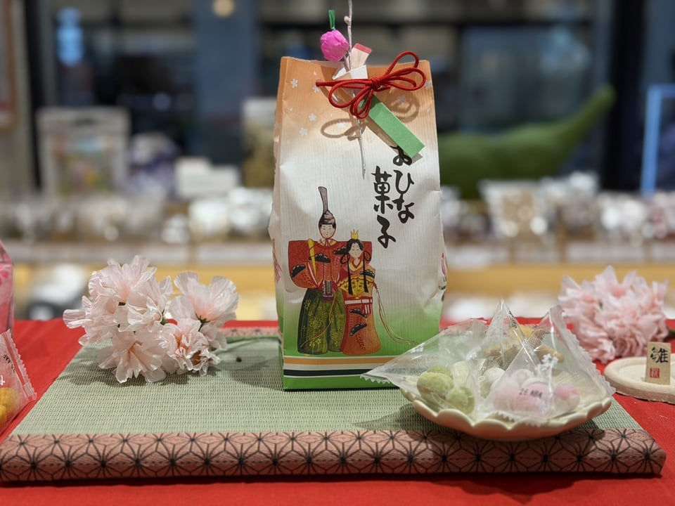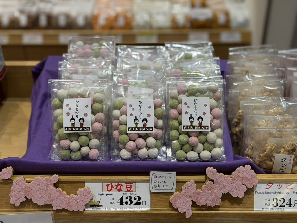 「ひな豆」(税込432円)やテトラパックの個包装タイプの「ひな豆」(税込270円)、お雛様柄の和紙袋に入ったアソートセットの「雛祭りセット」(税込864円)も好評販売中です。