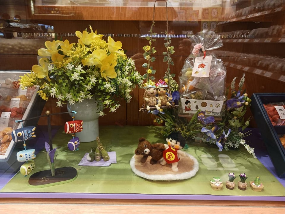 端午の節句の小物が髄所に飾られたレジ下のショーケースの中では金太郎さんと熊さんがお相撲をとっている姿を落花生のマスコットさん達が見守っています。![]()