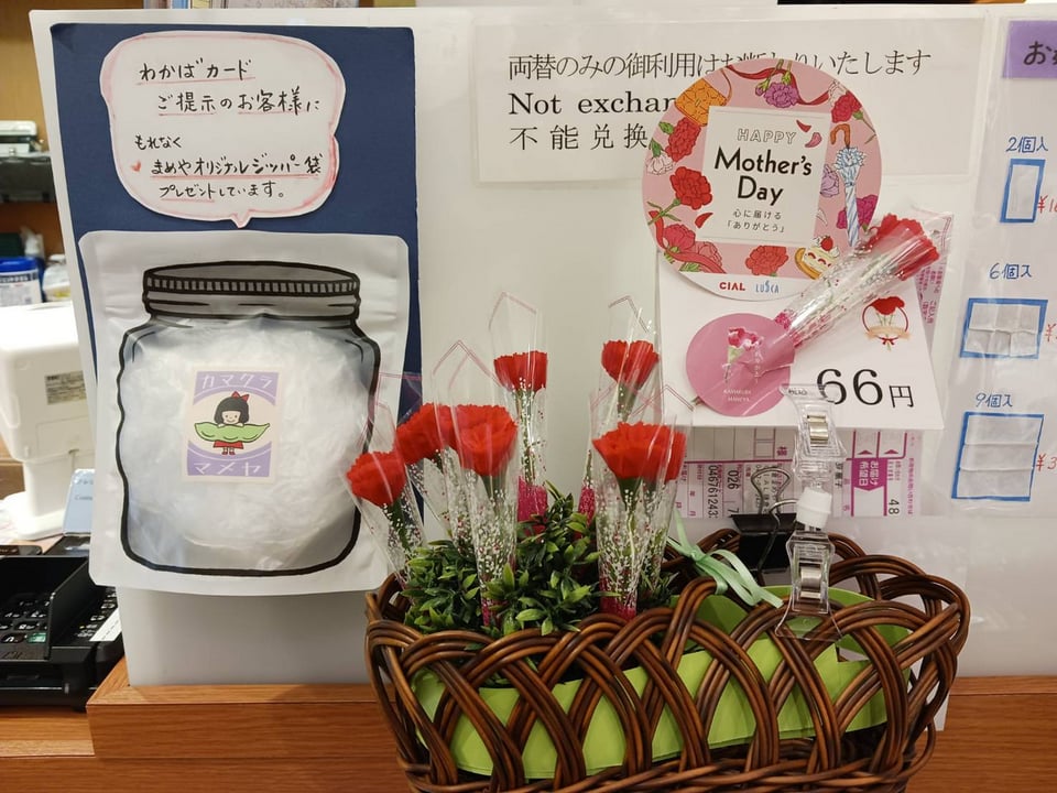 来月10日の母の日に向けてカーネーションの飾り(税込66円)をお付け出来ますので、豆菓子と共にお母さんへの感謝の気持ちを届けられます。