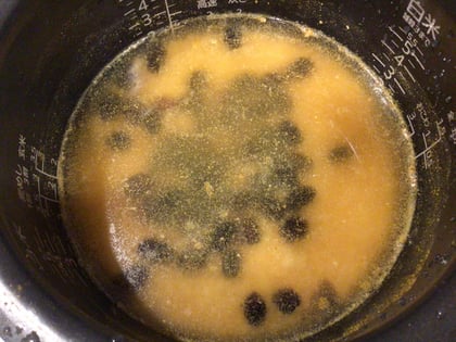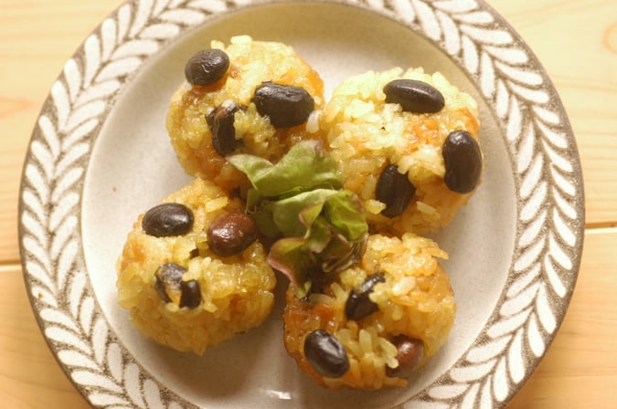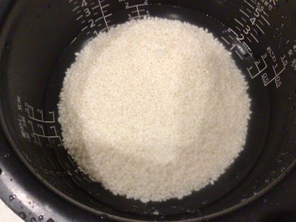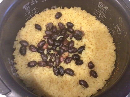 2)もち米にお釜に記載の分量の水を入れ、カレー粉、コンソメ、塩、黒豆を混ぜて炊く。![]()