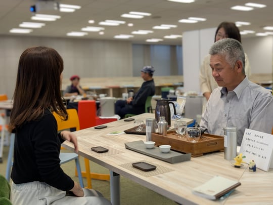 高塚さんによんこんを淹れていただくのを待つ茂木さん