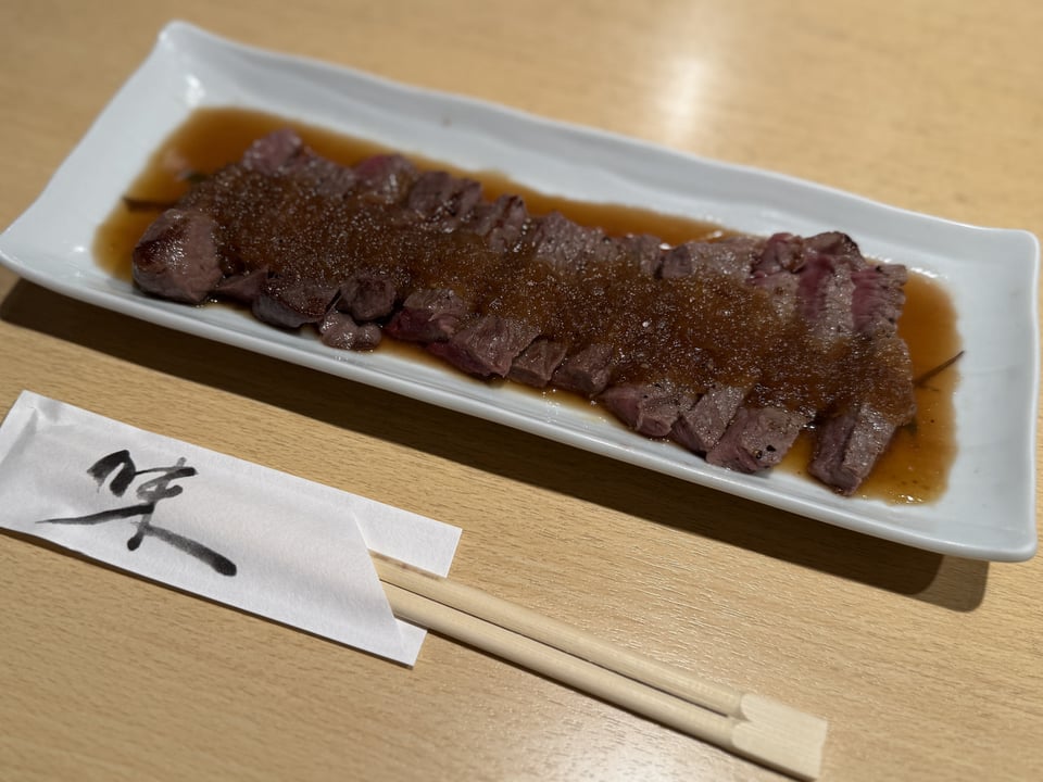 柔らかく口の中でとろけるろど!噛めば噛むほど肉の旨みと汁がじゅわっと広がる牛レアステーキに自家製のタレをかけて食べるのがおすすめです。