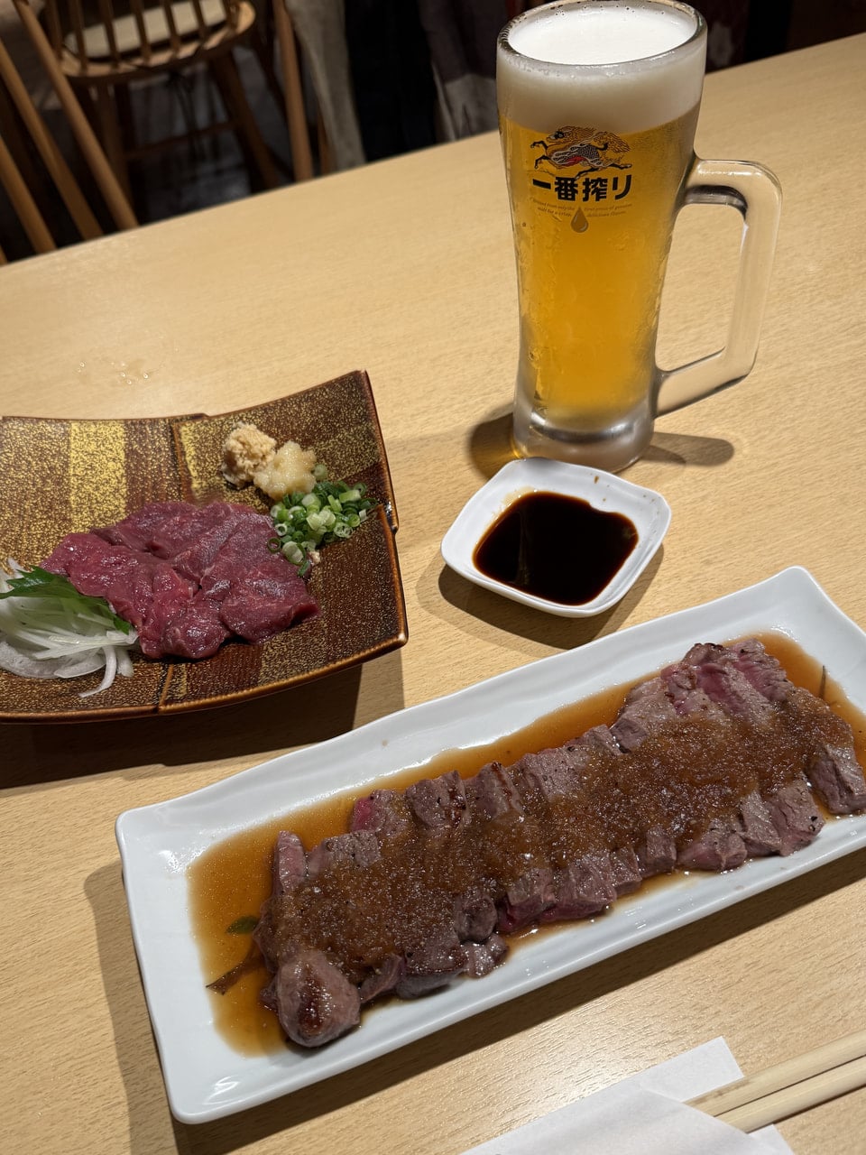 新鮮な馬刺しは臭みはまったくなく、こちらも噛むほどにうまみが引き出される1品。にんにく、しょうが、小口ねぎなどを合わせて、専用のアマダレにつけていただくともう…ビールが止まらない!!!ですよ〜。