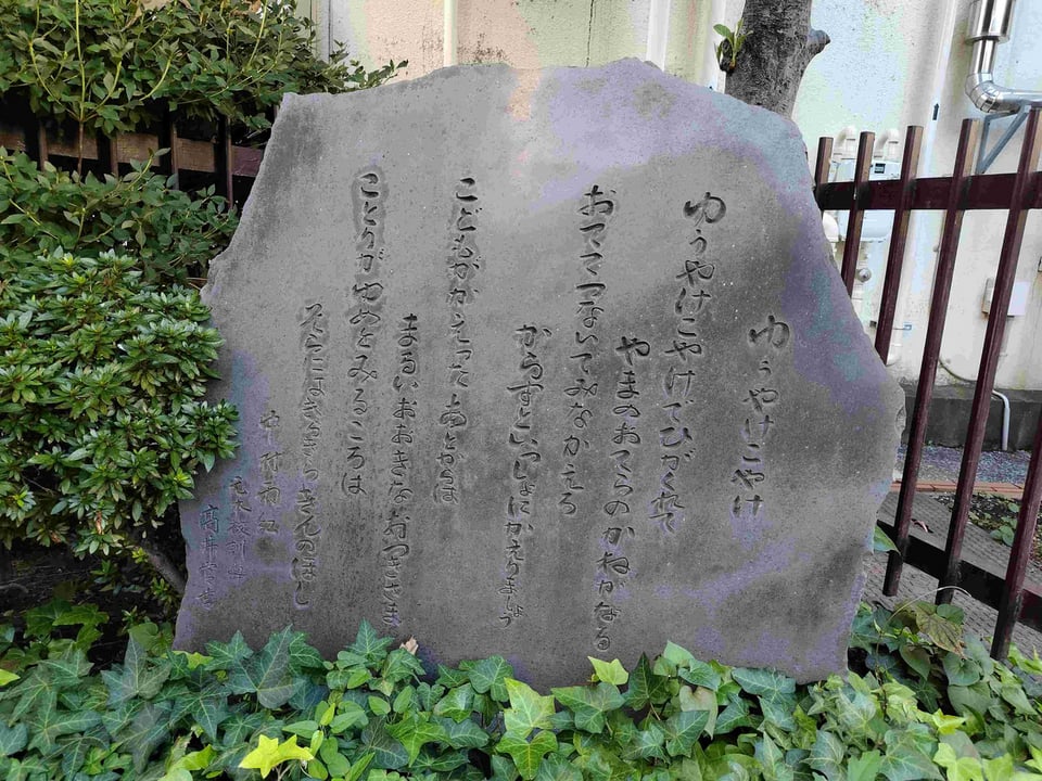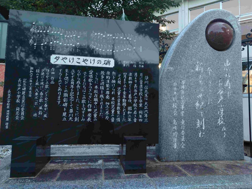 作曲の草川信氏の勤めていた渋谷区立長谷戸小学校にも石碑があります。生まれ故郷の長野市にある往生寺には、「夕焼小焼」のモデルとなった鐘や歌碑があるそうです。