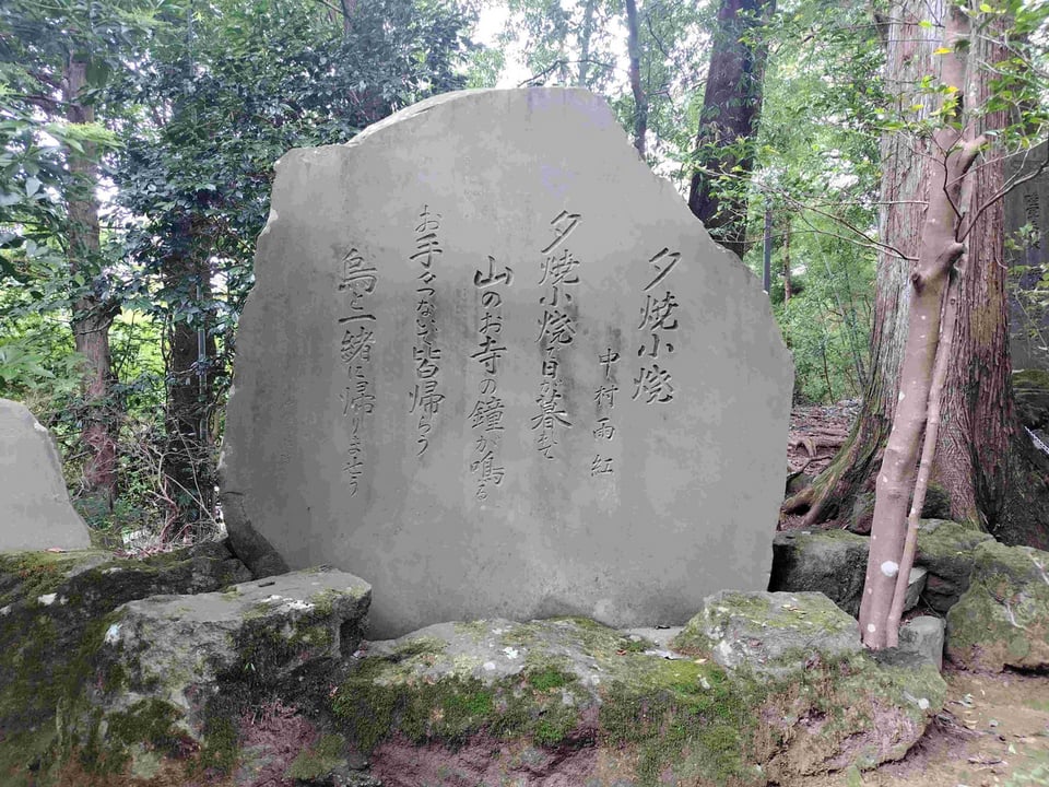 東京都八王子市上恩方町(かみおんがたまち)にある宮尾神社の宮司の子として生まれ、1923年、「夕焼小焼」を発表した当時は荒川区立第三日暮里小学校で教師をしていました。雨紅は、八王子駅から上恩方町までの約16kmを徒歩で帰っていたのですが、その帰り道に見た夕焼けに、幼い頃の想い出や情景などを重ねつつ描いたとされています。宮尾神社、最初に教師として勤めた荒川区立第二日暮里小学校、作品発表時に勤めていた第三日暮里小学校には、それぞれ石碑があります。