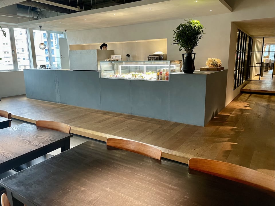 配管などが敢えて見えるスケルトン天井に、柔らかな感じのある木の床。開放感あふれて、イマドキ•オシャレプレイス!という感じ。お話伺ったのは、日比野拓さん。カフェを運営する日比野設計の代表取締役会長をされています。