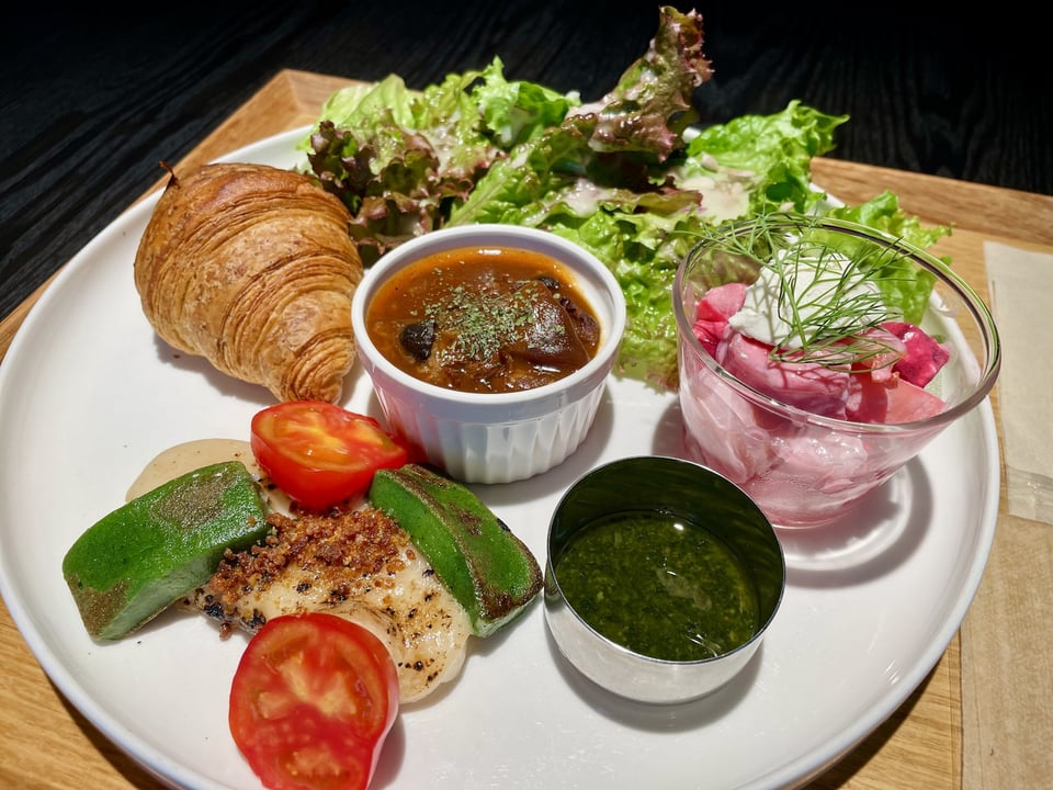2種もしくは3種のデリを選んで、サラダ、シチューもしくはビーガンカレー、パンかライスを選んで、ひと皿に乗せた目にも楽しいメニュー。私は、「海老とビーツのディルサワークリーム」と「よもぎ生麩とあぶりビーガンチーズのカプレーゼ」、ビーフシチュー、クロワッサンをいただきました。