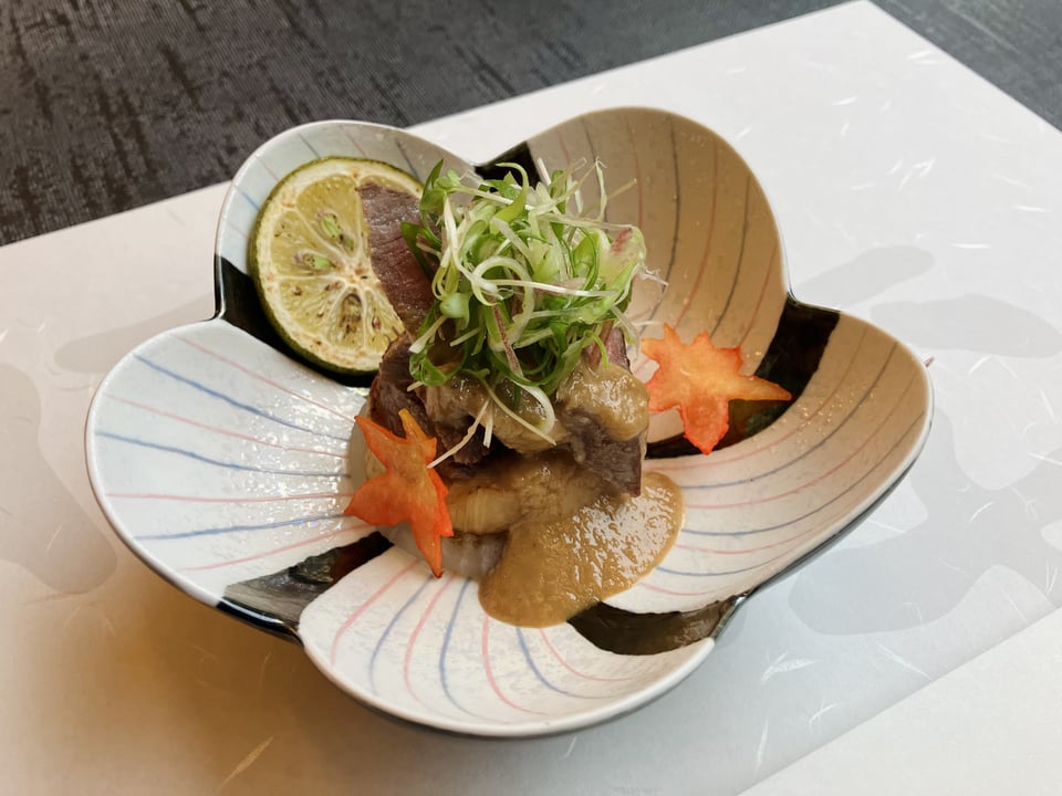 大根・白茄子・米沢牛の希少部位「かめのこ」を重ねた贅沢な一品。