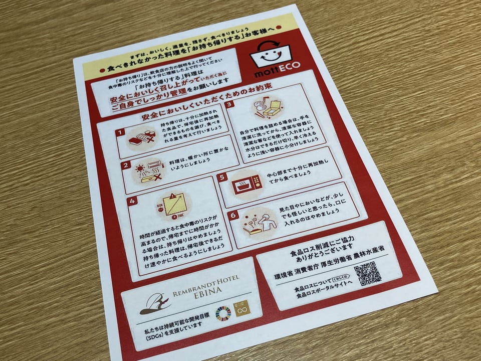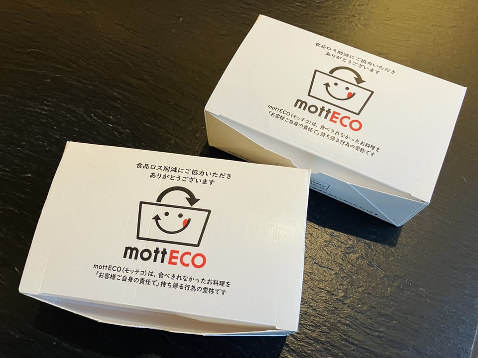 •食べきれなかった料理は、環境省推進の食品ロス削減サービス「モッテコ」で、専用容器に入れてお持ち帰りが可能。