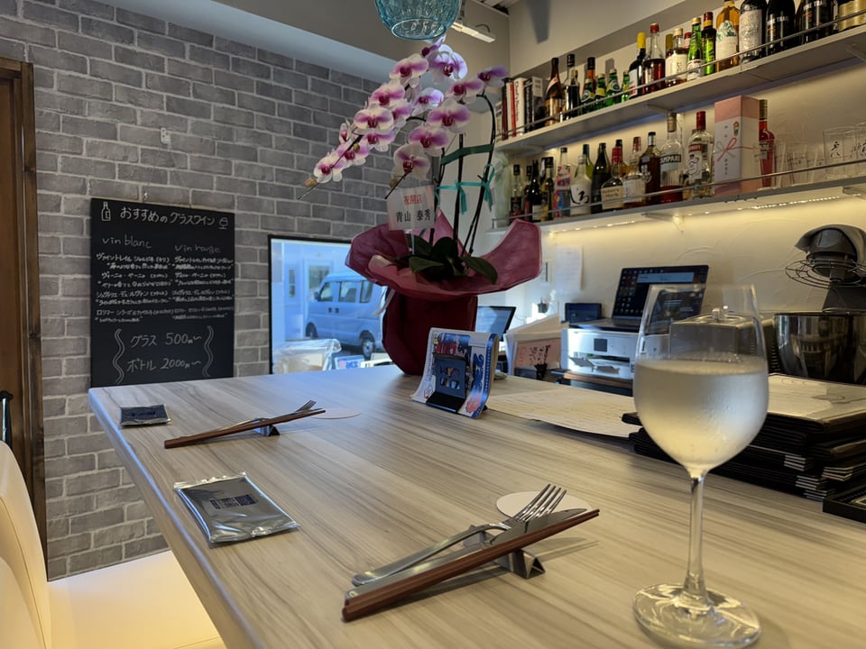 お昼はコース、夜はお酒を中心にアラカルトをいただけるビストロスタイル。カウンター席もテーブル席もあって、お一人でもお仲間とも楽しめます🪑